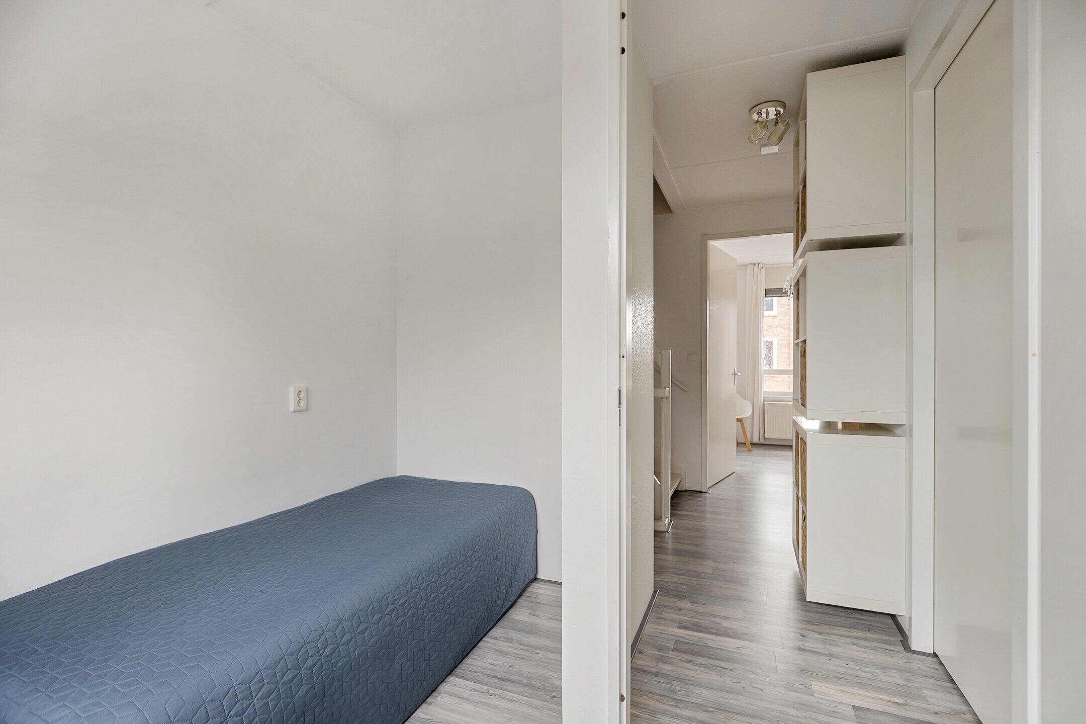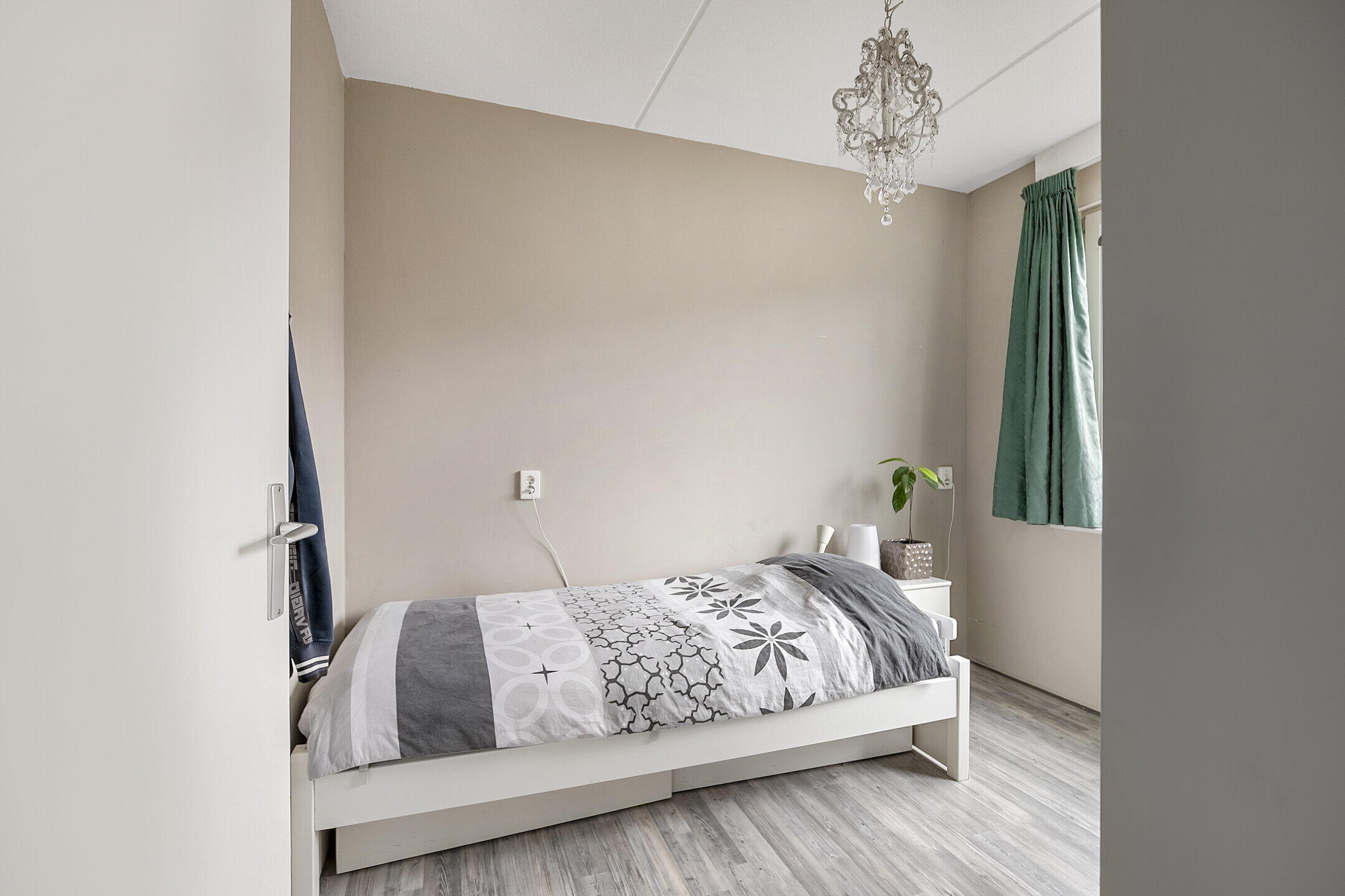 De overloop geeft toegang tot 3 slaapkamers en de badkamer. Er zijn 2 slaapkamers aan de achterzijde en de voorzijde heeft een ruime 3e slaapkamer over de volle breedte van de woning. De badkamer ligt centraal en is voorzien van een bad-/ douchecombinatie, het 2e toilet en een brede wastafel. Deze verdieping is voorzien van laminaatvloeren.